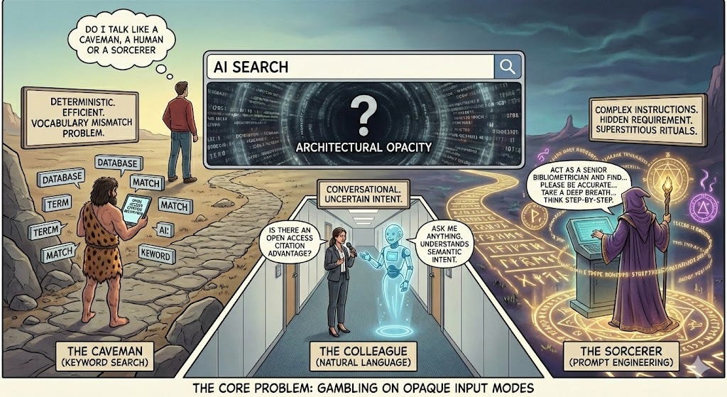 For twenty years, we were trained when using academic databases1 to speak a specific pidgin language: “keyword search”. We stripped away grammar (e.g., “of”), articles (e.g., “the”), and politeness2. We didn’t ask, “Is there an open access citation advantage”. Instead we just typed: open access citation advantage. It was unnatural, but it was deterministic. We knew that if we typed X, the machine would look for X.