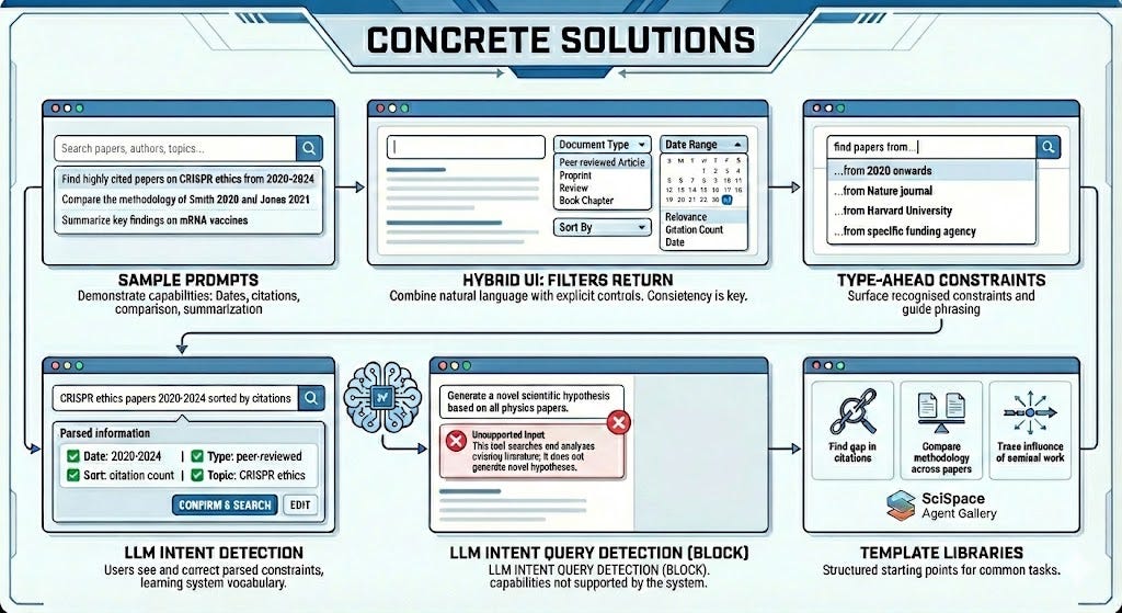 Sample prompts that demonstrate expectations. It is common practice today to list sample queries below the search box. But example queries should be chosen with care to address both input mode and capability. Are examples terse keywords or elaborate instructions? Do they demonstrate filter syntax, complex operations, or both? Prompts like “Find highly cited papers on CRISPR ethics from 2020-2024” reveal that dates and citation thresholds are recognised; “Compare the methodology of Smith 2020 and Jones 2021” reveals that document comparison is available.
