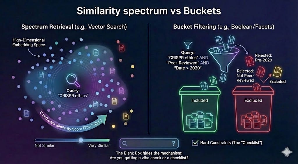 But this is not always the right abstraction. Users don't only want semantic similarity. They often want what Turnbull calls selectors or what you can think of as binary buckets - structured filters on specific binary attributes. When a researcher asks for “peer-reviewed papers on CRISPR ethics published after 2020," they're expressing a query with clear selectors: document type (peer-reviewed papers), topic (CRISPR ethics), date range (post-2020). They expect the system to filter on these attributes or buckets not merely find passages that are "close" in some abstract embedding space.