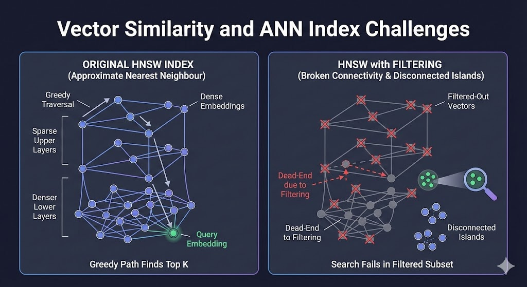 Vector similarity of dense embeddings usually involve finding the top K most similar embeddings to the query embedding. With a large enough collection, it may be too slow to do a brute force search so systems employ approximate nearest neighbour (ANN) indices like HNSW (Hierarchical Navigable Small World). But these indices are optimised only for the distribution of the full dataset. For example, HNSW builds a hierarchical graph where nodes (vectors) are connected to their nearest neighbours across multiple layers, with navigation starting at sparse upper layers and refining at denser lower layers. During search, the algorithm greedily traverses edges towards the query vector. However, when filters exclude many vectors, the graph connectivity breaks—the greedy path may dead-end at filtered-out nodes, or the remaining filtered subset forms disconnected islands in the graph structure.