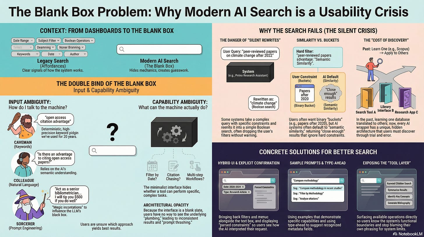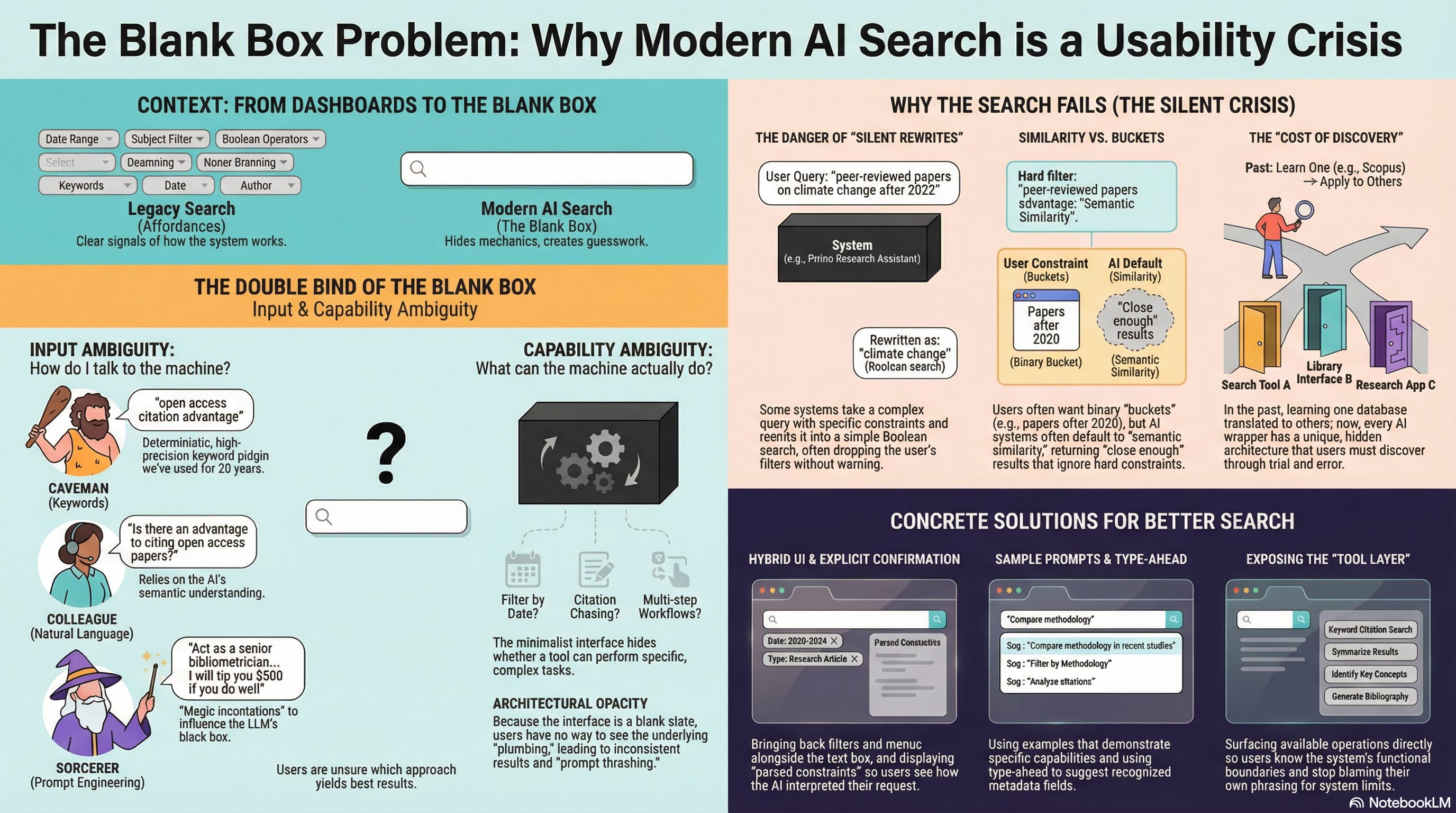 We’re in a transitional period where AI search tools vary enormously across many dimensions—different retrieval abstractions, different filter recognition capabilities, different workflow architectures. Yet they present nearly identical blank text boxes that reveal nothing.