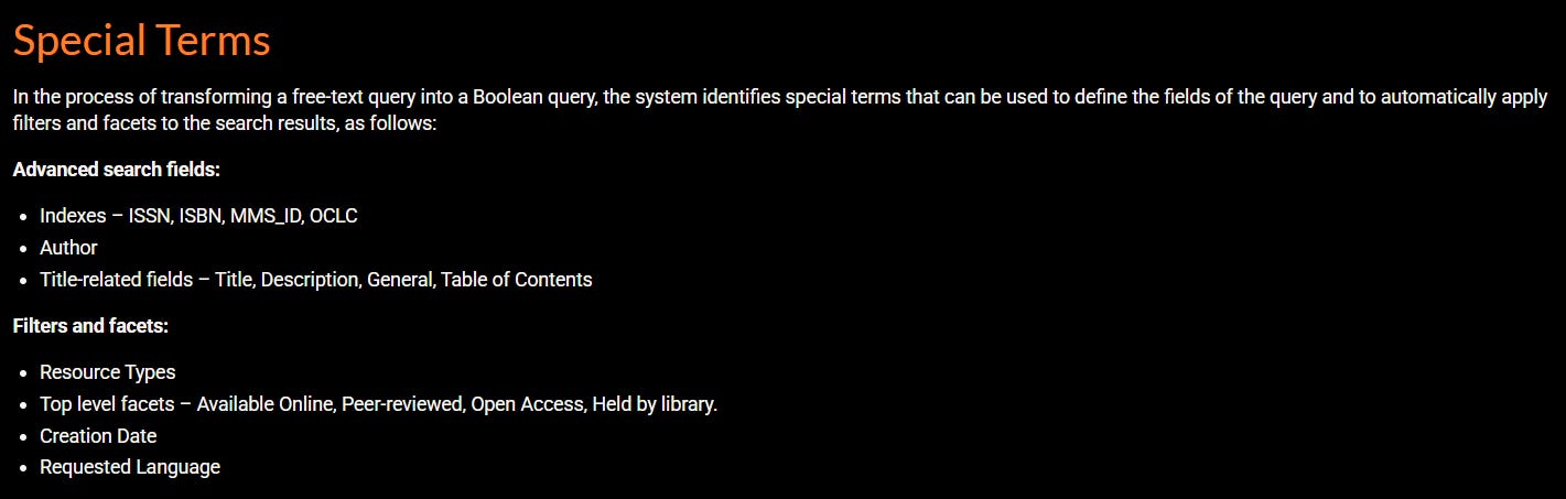 I would wager many people might think anything that is a filter in Primo NDE could be invoked by natural language queries. In fact, while a lot of filters and facets can be invoked this way (e.g. resource type, open access, available online, peer-reviewed, held by library, language, creator), some cannot (e.g. subject, collection, etc.).