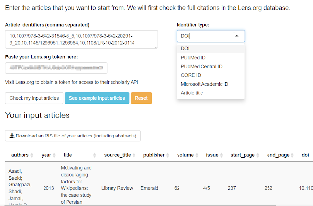 Enter those articles in a comma seperated way into the shiny app - tab "article input". Also add the Lens.org API key (free with some limits) and click check my input articles.