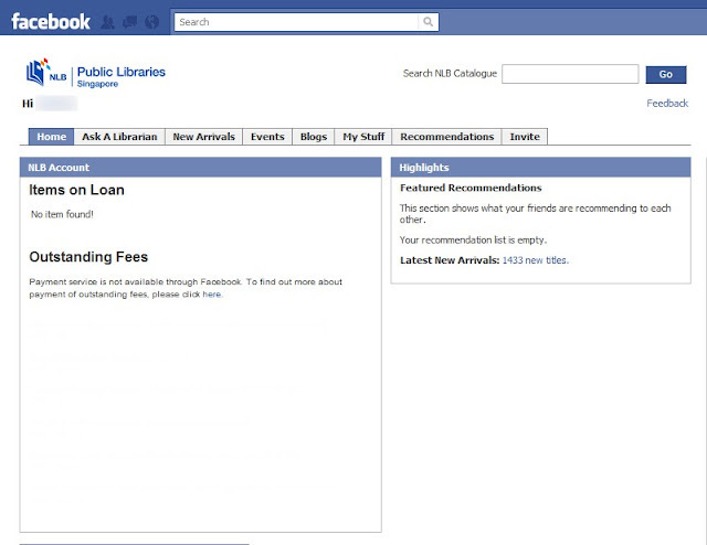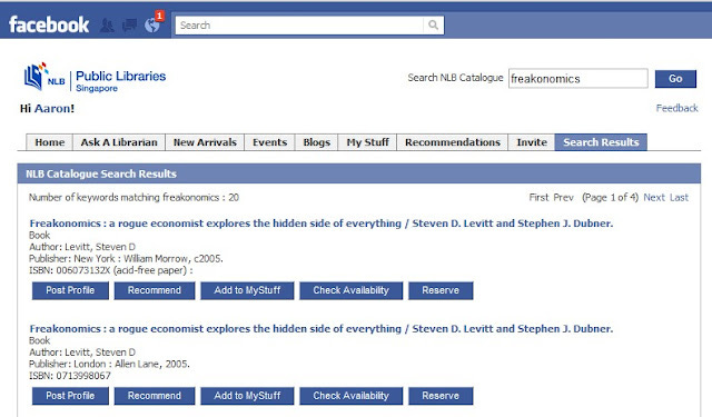 Many Library webpages have began to embed library search boxes, but some (I heard of 2) have even started creating Facebook apps that not only allow you to search the catalogue in Facebook, but also see the result and make reservations. One example is my own country's National Library Board, myLibrary Facebook app.
