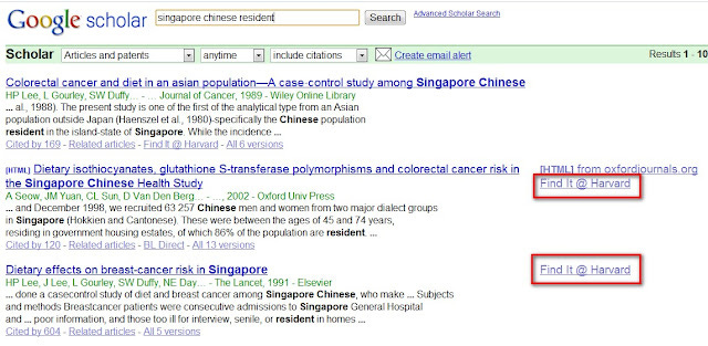 Example of Library Links in Google Scholar, Members can access full-text via Harvard Subscription