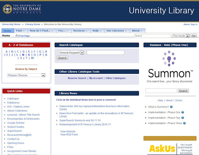 Example of LibGuide as library home page, University of Notre Dame Australia University Library