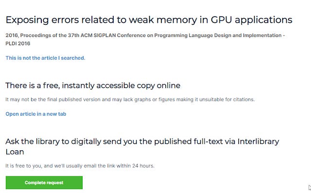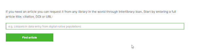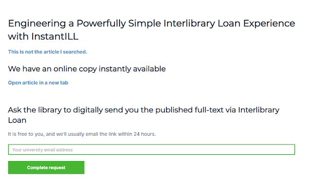 It will respond with the item it thinks you are looking for, a free copy if available (it knows what subscriptions you have via your link resolver or presumably if there is a free OA copy, though in this example it shows a subscribed copy) and lastly , a box for you to enter your email if you want the ILL/DDS process to go on as per normal .