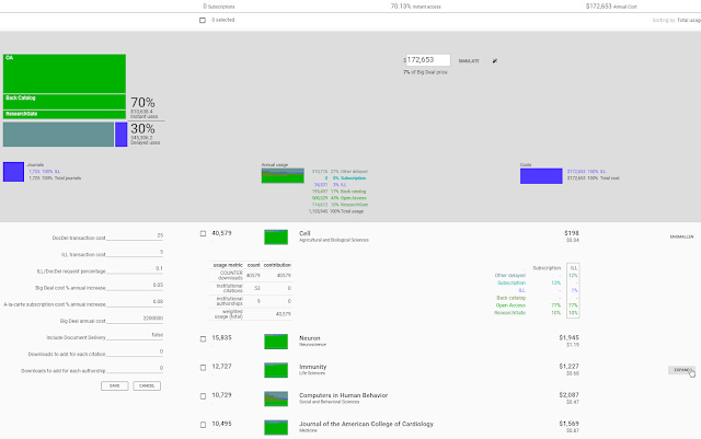 Our Research announced a new tool - Unpaywall Journals which "is a data dashboard that combines journal-level citations, downloads, Open Access statistics and more, to help librarians confidently manage their serials collections". To expand on this, using Unpaywall usage and stats it projects your usage for the next 5 years and together with parameters you set like rate of ILL, ILL cost, expected annual increases, cost of subscription etc, predicts the net impact of cancelling subscriptions and relying on open access articles + subscriptions.