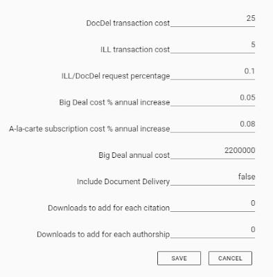 Libraries can adjust parameters like cost of ILL per transaction, ILL request percentage , Big deal cost annual increase etc.
