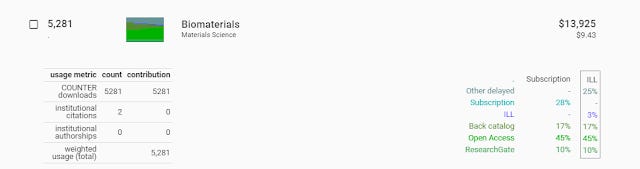So for example, for the journal Biomaterials you can see that across 5 years. given parameters set (DDS cost, expected requests, expected annual increases), if you cancel the journal you would actually save $13,925.