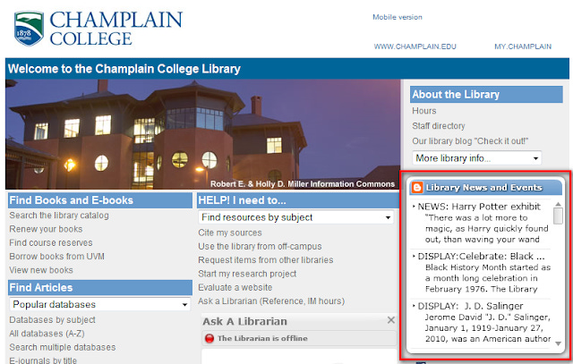 Below we have an example from the Champlain College Library using a blog to generate RSS news feed