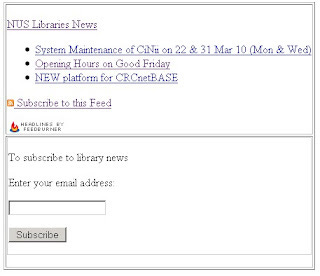 In particular, I have being thinking of how libraries can provide news events (opening hours, library talks tutorials, service outrages, changes in policy) as RSS feeds. The benefits of providing news in RSS feeds is obvious basically increased portability as well as ability to filter/merge structured data etc.