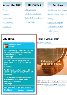 Below, we see an example of library news being presented in a Twitter feed widget, from BlackHawk College.