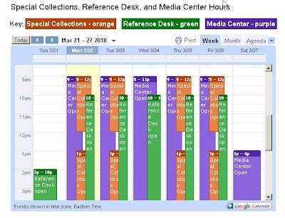 While this works fine for one off events, what if you are trying to show opening hours? You can of course do what the Jack Traver library does, add as an event the times the library is open and embed the google calendar