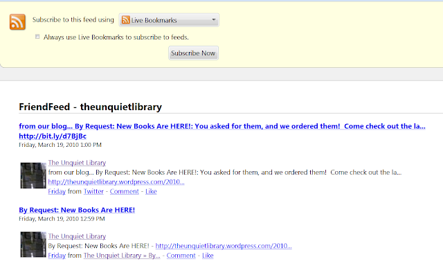 If one thinks outside the box, one could also consider using FriendFeed to generate the news RSS feed. I have written in the past about libraries on Friendfeed, where libraries aggregate various social media accounts into one stream in Friendfeed. But besides viewing the stream in friendfeed, you can also acquire the RSS feed. Below you see the RSS feed of the FriendFeed account of Theunquietlibrary
