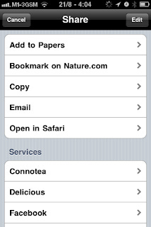 Of the Nature sharing options there are 2 academic networks, Connotea (a academic version of delicious) and Paper (a citation manager like EndNote). I don't have the later (and don't use Connotea) so I can't test it, but given we are talking about academic papers, I wonder if the whole article citation is captured as opposed to just doing a bookmark on the url.