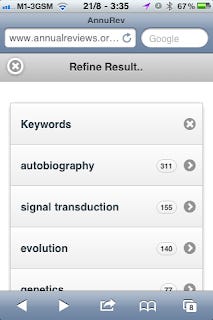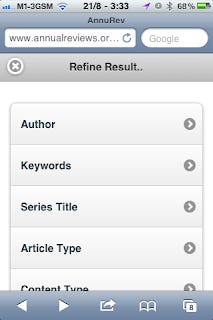 In Annual Reviews app, there is a refine button at the bottom right, clicking on it allows you to refine by many facets anything from keywords to Article Type, you even get to see the number under each facet. This is probably the most advanced implementation I have seen thus far. I hope more mobile databases will have this feature since searching is harder than browsing on mobile given the awkwardness of typing.