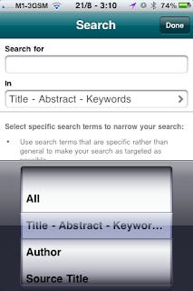 Of the databases I tested which I had access to, the default search is typically a keyword or "Anywhere" search. Some of them I couldn't tell at a glance, were probably the same as the desktop version. No doubt the default search in mobile databases follows what is found in normal desktop versions, but I can't help but wonder if this is a mistake.