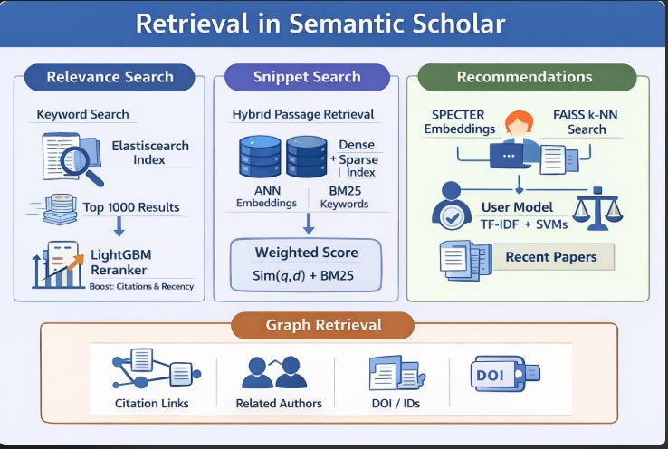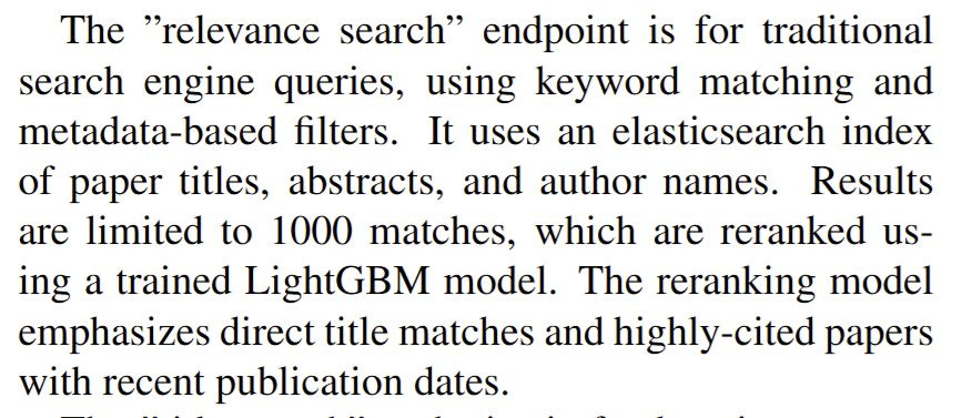 There is one exception: their newer “snippet search” API endpoint, designed for retrieving text passages from the S2ORC corpus, does use a genuine hybrid approach. Passages are embedded using mxbai-embed-large-v1, and results are retrieved using the union of embedding-based and keyword-based matches, ranked by a weighted sum of embedding similarity and BM25 scores (Kinney et al., 2023). But this is a specialised API for full-text passage retrieval—not the main search you get from the Semantic Scholar Search bar that most users encounter.