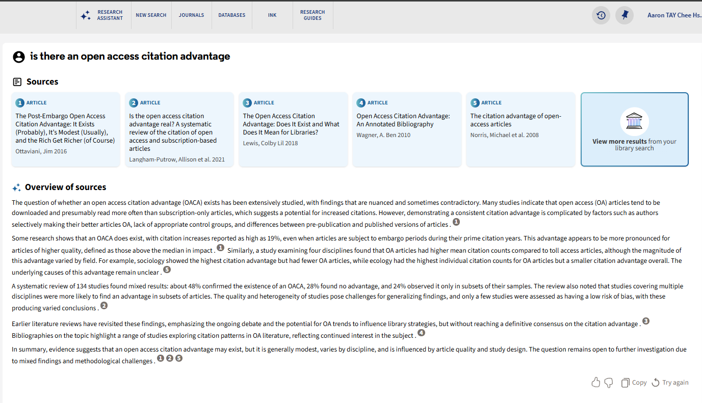 Quick RAG tools like Elicit, scite assistant, and Primo Research Assistant synthesise information across multiple papers to generate answers with citations, typically using Retrieval Augmented Generation. You ask a question, the system reads through papers, extracts relevant information, and writes you a summary with references. It’s not just ranking anymore—it’s creating new text based on the literature.