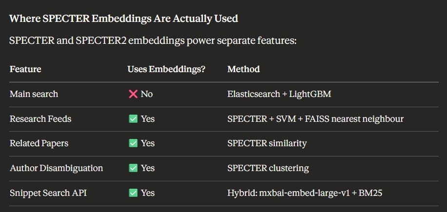 So where do the embeddings come in? Semantic Scholar developed SPECTER and SPECTER2, sophisticated document embedding models trained on citation graphs. But these power auxiliary features: research feed recommendations, author disambiguation, paper clustering, and finding related papers. The embeddings exist; they’re just not driving the core search experience.