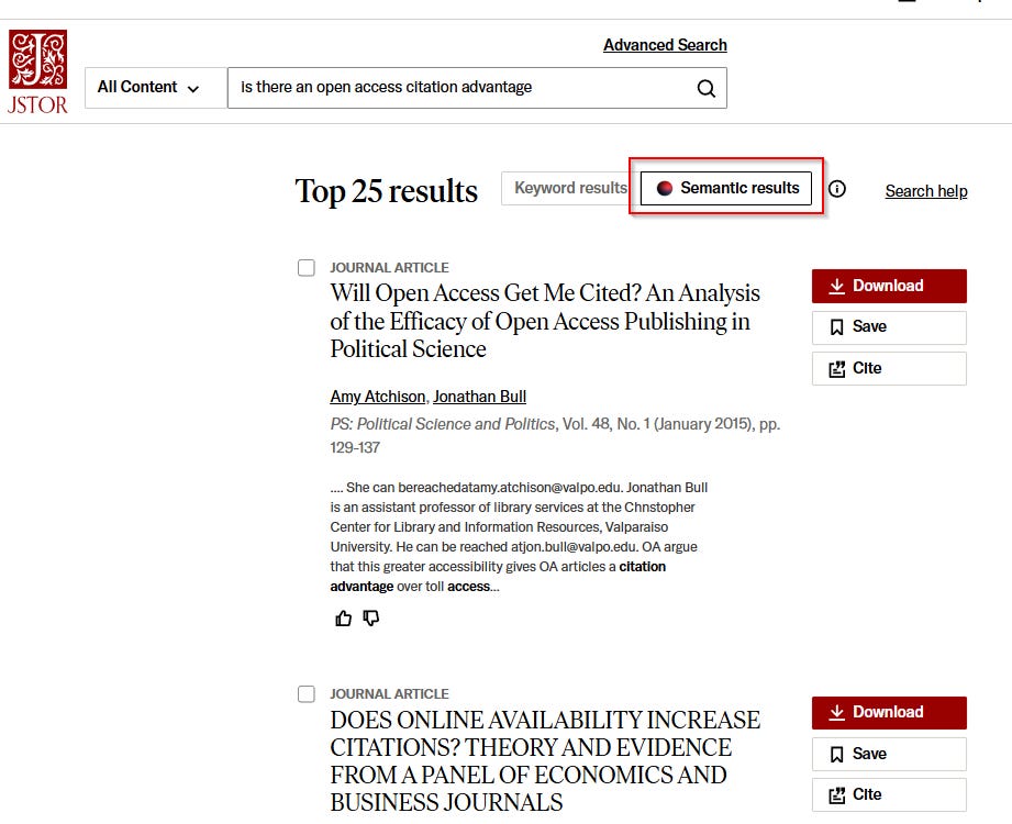 So what we’re saying is that anything that goes beyond traditional keyword matching—such as semantic search via embedding search/match—is considered “AI-powered search.” An example is JSTOR beta’s semantic results function.