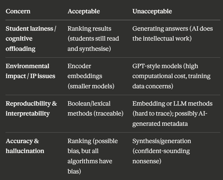 If you’re worried about generative AI making students lazy, you might be perfectly fine with AI assistance as long as it’s just ranking results. Let the algorithms find relevant papers, but make students read and synthesise themselves.