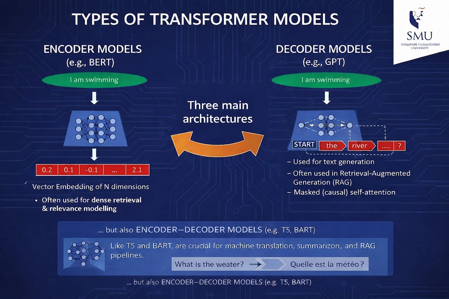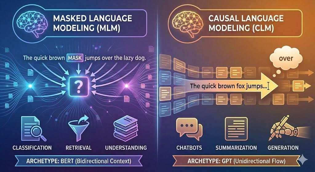 How decoder models (LLMs) are trained: GPT-style models are trained on massive text corpora using “next token prediction” (also known as causal language modelling)—given a sequence of words, predict what comes next. This autoregressive training is what enables them to generate fluent text. The model learns statistical patterns across billions of documents, building an implicit representation of language, facts, and reasoning patterns.