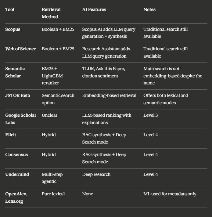 Levels here may not be the right framing, as the four different categories are largely orthogonal (except maybe Level 3 is a subset of level 2), but they map to most common academic search products (e.g. Level 4 is usually Deep Research) and higher levels generally reflect higher risk and greater amount of pushback from librarians.