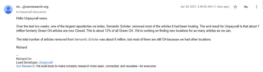 On April 28th, Richard Orr a developer with Unpaywall , posted on the mailing list a quiet announcement that over the past few weeks they detected Semantic Scholar removing most of the papers that they used to be hosting.